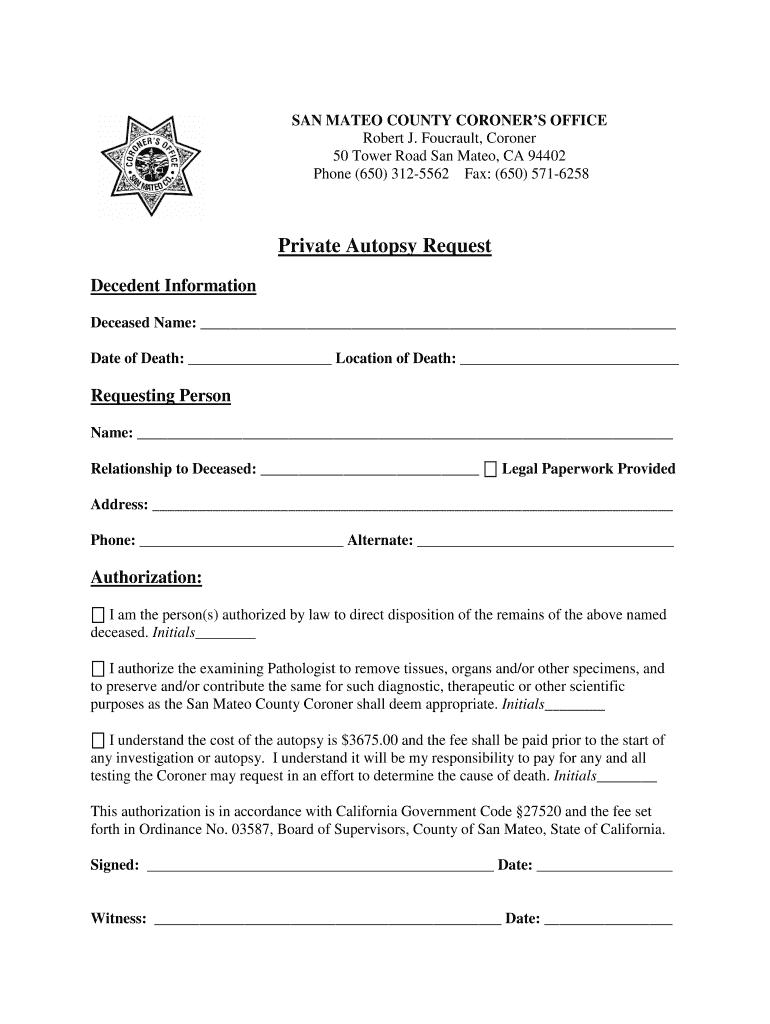 SAN MATEO COUNTY CORONERS OFFICE Robert J. Foucault, Coroner 50 Tower Road San Mateo, CA 94402 Phone (650) 3125562 Fax: (650) 5716258 Private Autopsy Request Decedent Information Deceased Name: Date