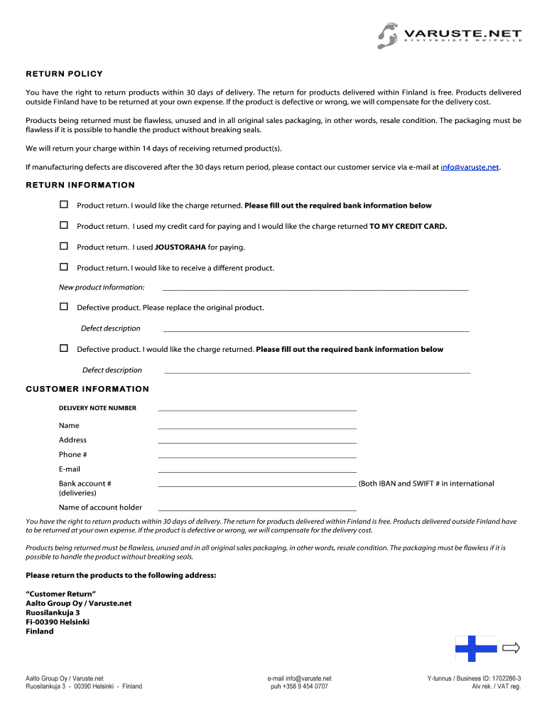 The Return Policy Form is a document used by customers in Finland to request a return or exchange of products within 30 days of delivery.