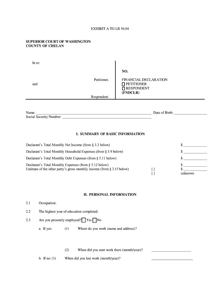 SUPERIOR COURT OF WASHINGTON. COUNTY OF CLAN. In re: NO. Petitioner, and (NDLR) Respondent. FINANCIAL DECLARATION PETITIONER RESPONDENT. Name: