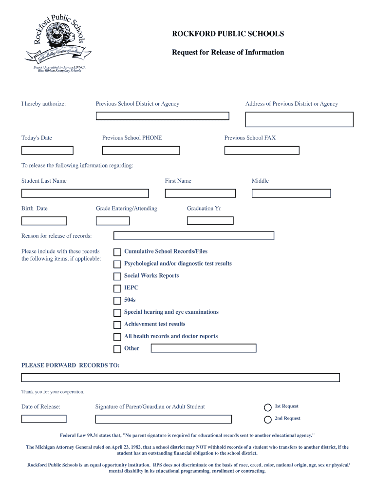 ROCKFORD PUBLIC SCHOOLS Request for Release of Information I hereby authorize: Previous School District or Agency Address of Previous District or Agency