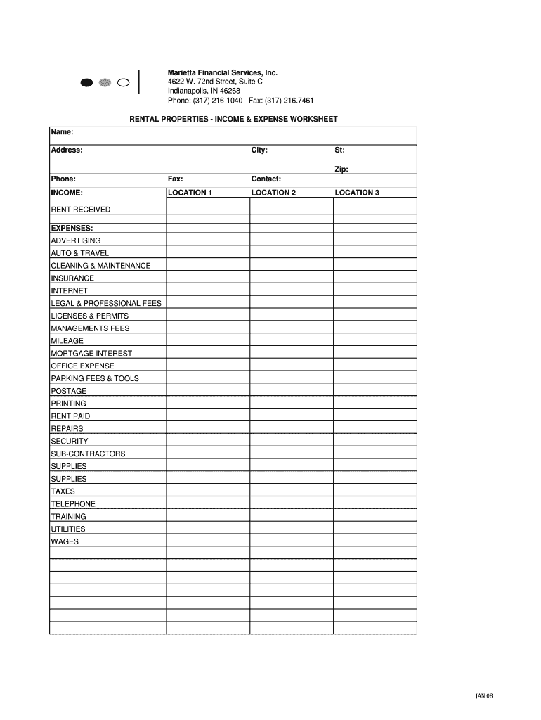 Rental properties' income & expense worksheet: name: address: city: st: zip: phone: fax: contact: income: location 1; location 2: location 3: rent received. Expenses ...