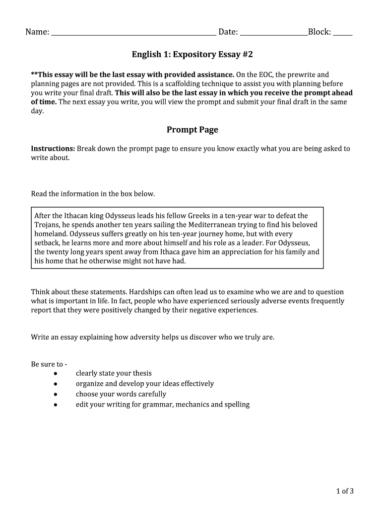 Name: Date: Block: English 1: Expository Essay #2 **This essay will be the last essay with provided assistance. On the EOC, the rewrite and planning pages are not provided. This is a scaffolding technique