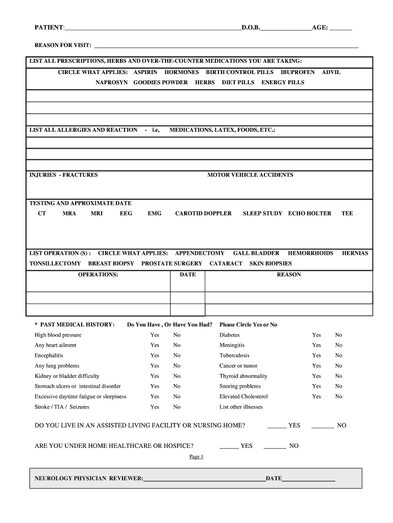 PATIENT: D.O.B. AGE: REASON FOR VISIT: LIST ALL PRESCRIPTIONS, HERBS AND OVERTHECOUNTER MEDICATIONS YOU ARE TAKING: CIRCLE WHAT APPLIES: NAPROXEN ASPIRIN HORMONES GOODIES POWDER LIST ALL ALLERGIES