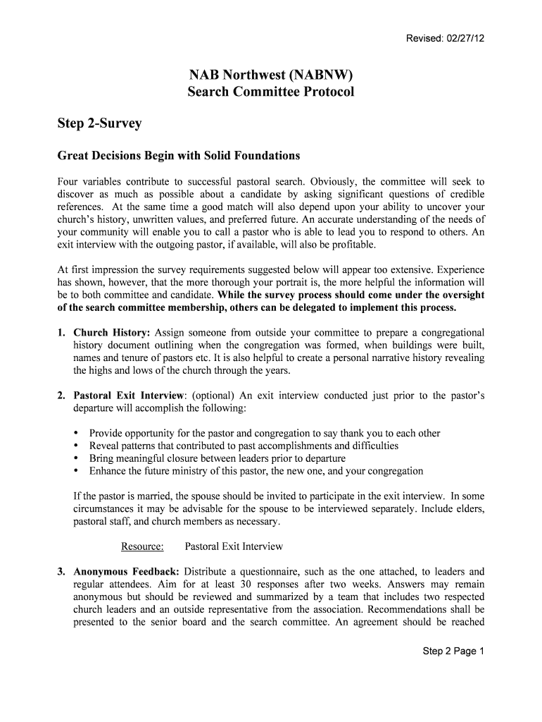 Revised: 02/27/12 NAB Northwest (NAB NW) Search Committee Protocol Step 2Survey Great Decisions Begin with Solid Foundations Four variables contribute to successful pastoral search. Obviously, the