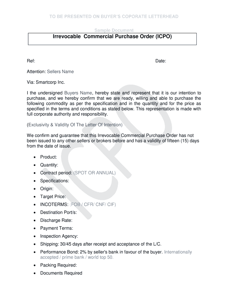 This document is a sample Irrevocable Commercial Purchase Order (ICPO) used to confirm the buyer's intention and readiness to purchase specified commodities under defined terms and conditions.