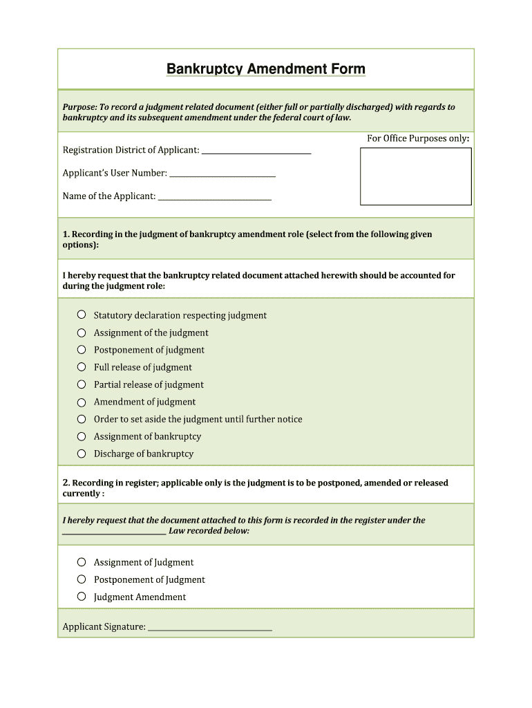 Bankruptcy Amendment Form Purpose: To record a judgment related document (either full or partially discharged) in regard to bankruptcy and its subsequent amendment ...