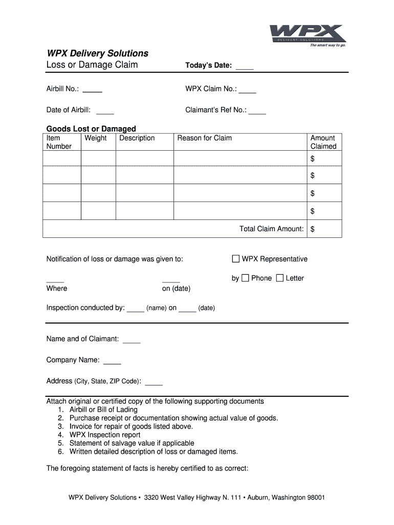 WAX Delivery Solutions Loss or Damage Claim Today's Date: Air bill No.: WAX Claim No.: Date of Air bill: Claimants Ref No.: Goods Lost or Damaged Item Number Weight Description Reason for Claim Amount