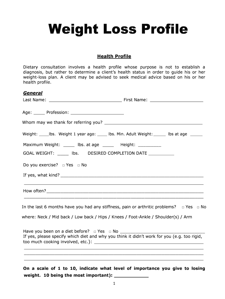 Weight Loss Profile Health Profile ALTO PROFILE Dietary consultation involves a health profile whose purpose is not to establish a diagnosis, but rather to determine a clients' health status in order