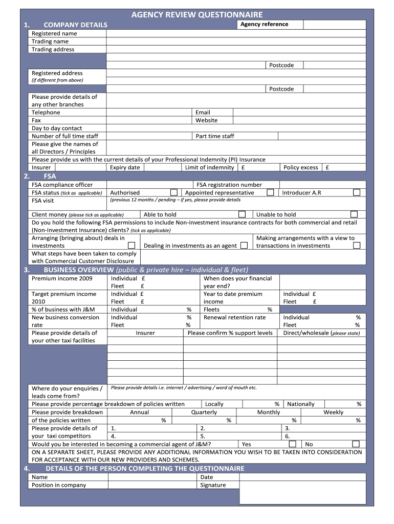 AGENCY REVIEW QUESTIONNAIRE 1. Agency reference COMPANY DETAILS Registered name Trading address Postcode Registered address (if different from above) Postcode Please provide details of any other branches