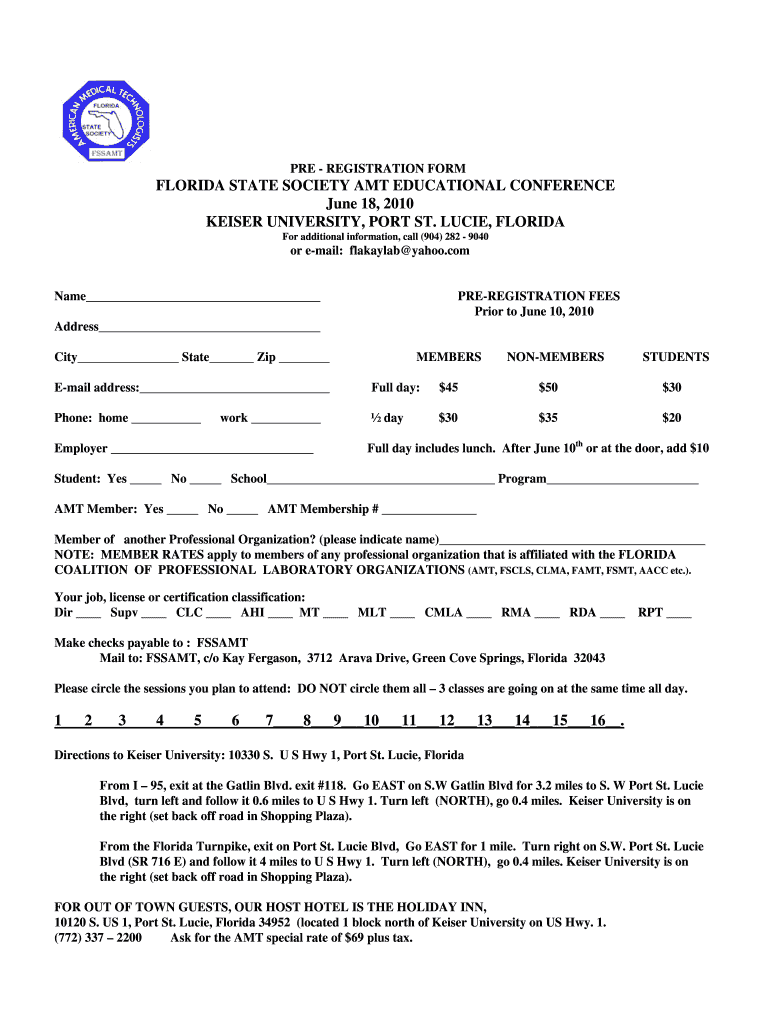 This document serves as a pre-registration form for the Florida State Society AMT Educational Conference to be held on June 18, 2010, at Keiser University, Port St. Lucie, Florida, detailing registration
