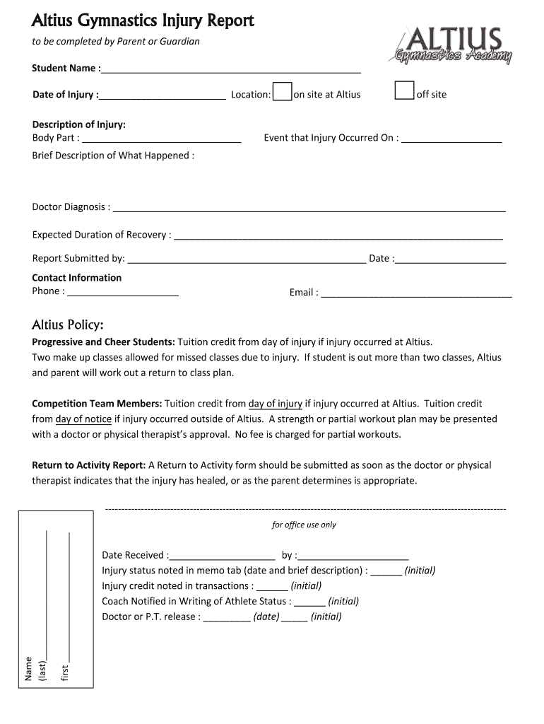Altius gymnastics injury report is a form used to document and report any injuries that occur during gymnastics activities at Altius Gymnastics Club.