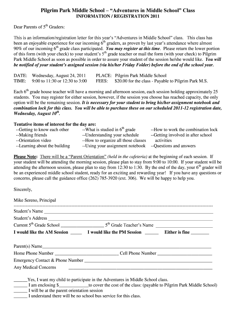 Pilgrim Park Middle School Adventures in Middle School Class INFORMATION / REGISTRATION 2011 Dear Parents of 5th Graders: This is an information/registration letter for this year's Adventures in Middle