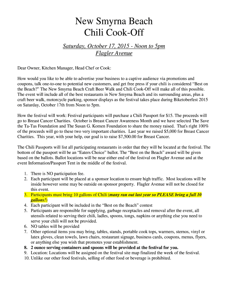 New Smyrna Beach Chili Cookout Saturday, October 17, 2015, Noon to 5pm Flagler Avenue Dear Owner, Kitchen Manager, Head Chef or Cook: How would you like to be able to advertise your business to a