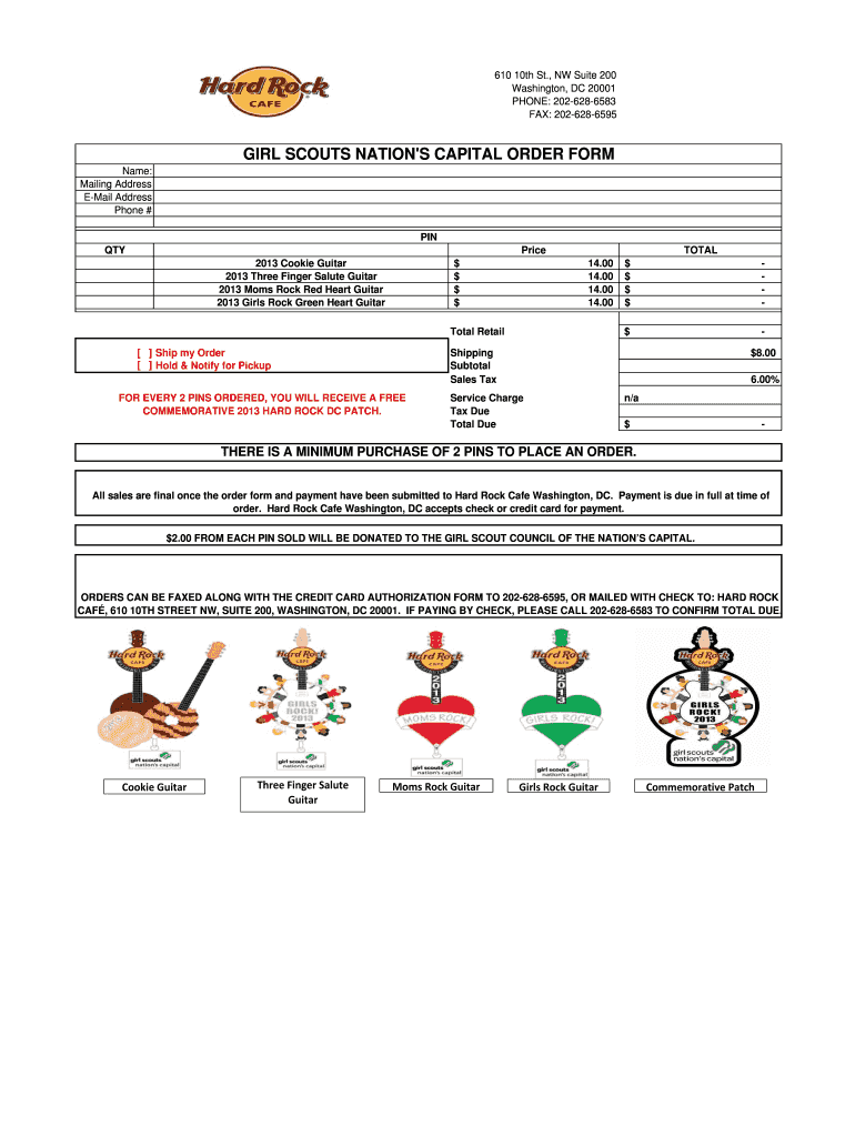 The Girl Scouts Hard Rock DC Order Form serves as a vital tool for purchasing commemorative merchandise. This order form allows individuals to select items such as guitar pins and patches that celebrate their support for the Girl Scouts Council of the Nation’s Capital. By utilizing this form, customers can easily place their orders for unique memorabilia while contributing to the council's efforts.