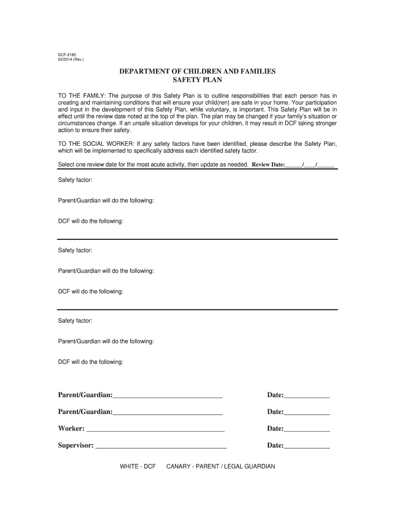 DCF2180 03/2014 (Rev.) DEPARTMENT OF CHILDREN AND FAMILIES SAFETY PLAN TO THE FAMILY: The purpose of this Safety Plan is to outline responsibilities that each person has in creating and maintaining