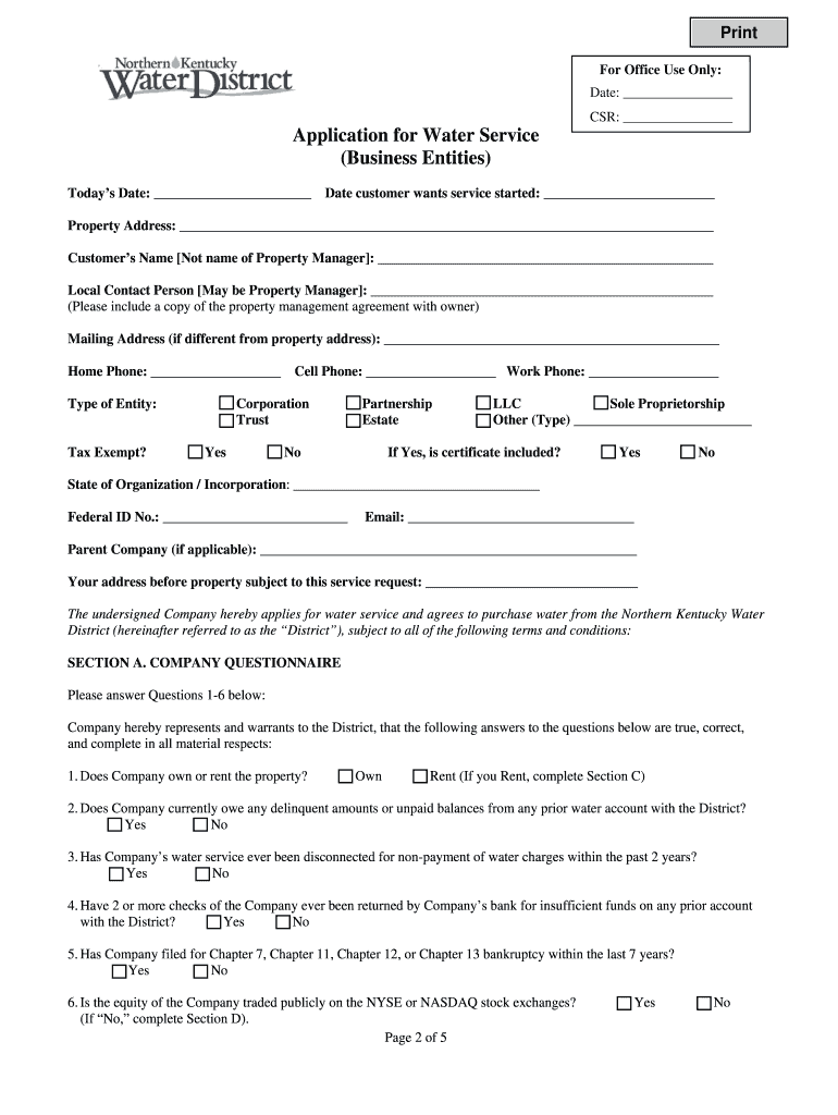 The Business Water Service Application is a form used by businesses in Kentucky to request water service from the Northern Kentucky Water District (NKWD).