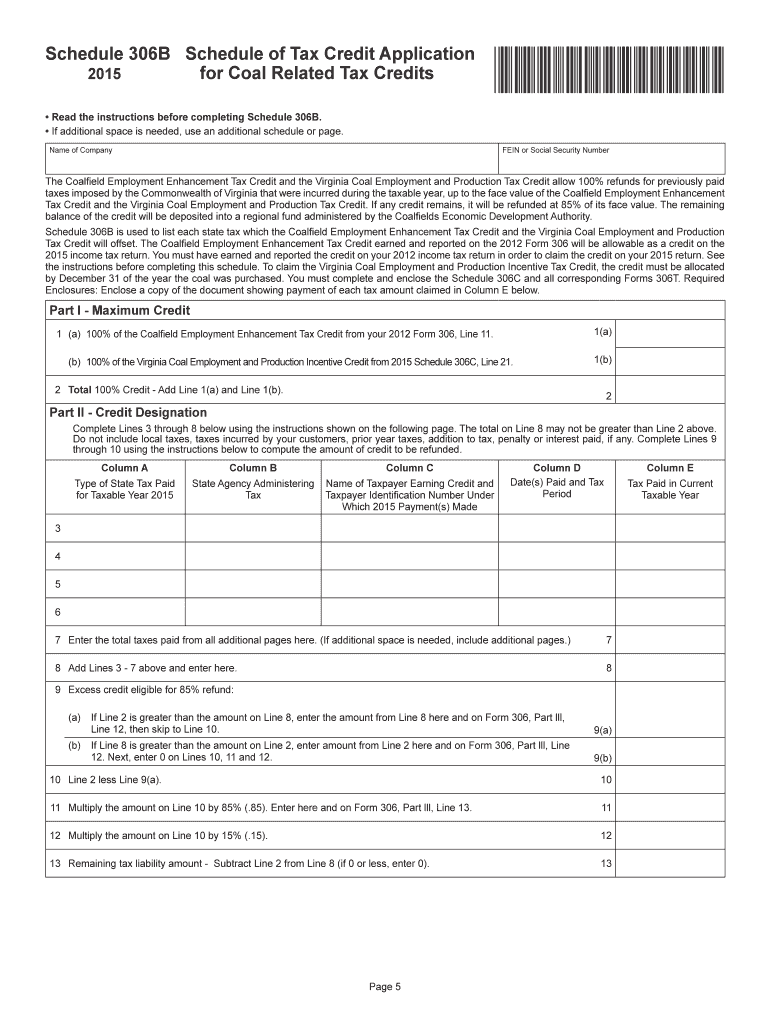 Schedule 306B is used to list each state tax which the Coalfield Employment ... Enhancement Tax Credit earned and reported on the 2012 Form 306 will be ...