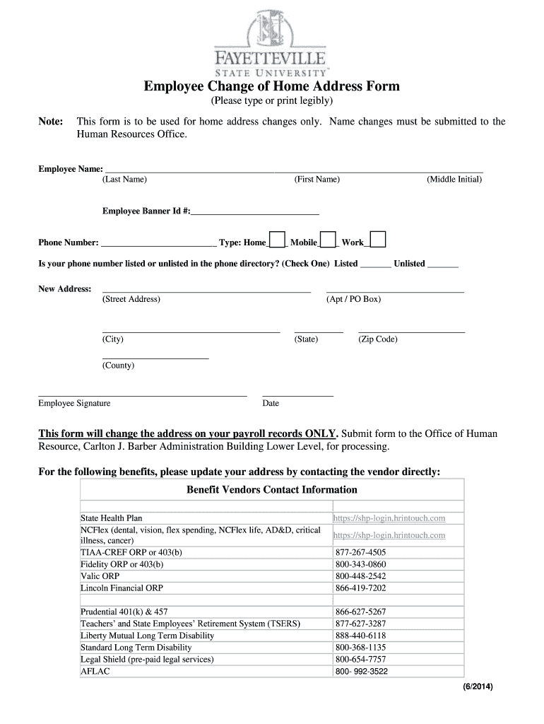Note: This form is to be used for home address changes only. ... This form will change the address on your payroll records ONLY. Submit form ... 800- 992-3522 ...