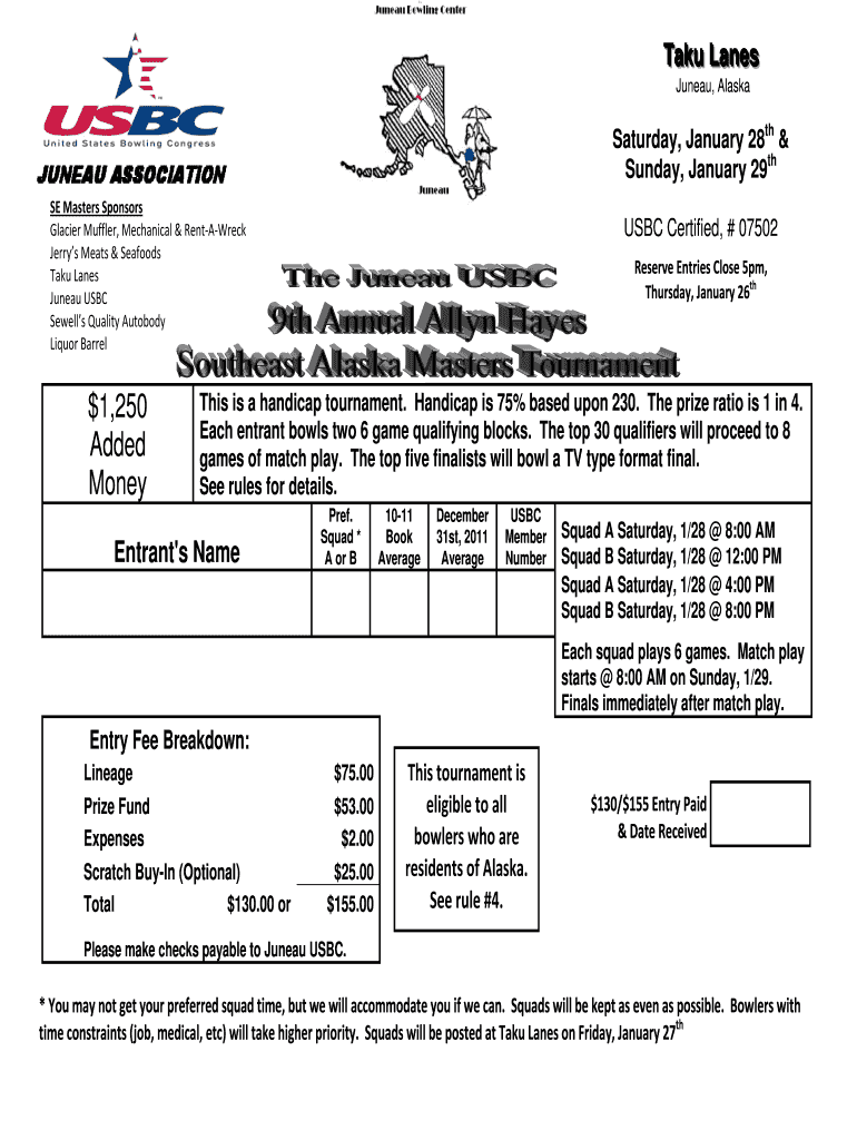 Allyn Hayes Southeast Alaska Tournament Rules, 2012 1. Entering Average Specifications: a. Bowlers will use their highest average from the 2010-11 bowling season ...