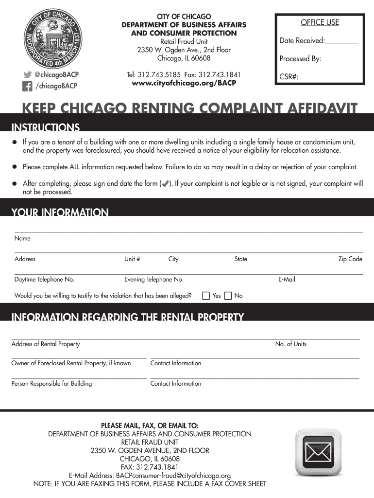 9 Mar 2015 ... KEEP CHICAGO RENTING COMPLAINT AFFIDAVIT. INSTRUCTIONS. OFFICE USE. Date Received:. Processed By:. CSR#: ...