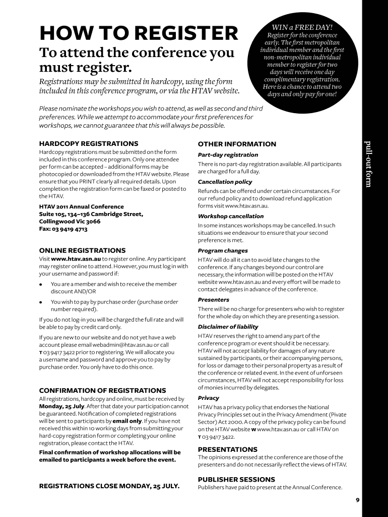 How to register To attend the conference you must register. Registrations may be submitted in hard copy, using the form included in this conference program, or via the HTA website. WIN a FREE DAY!