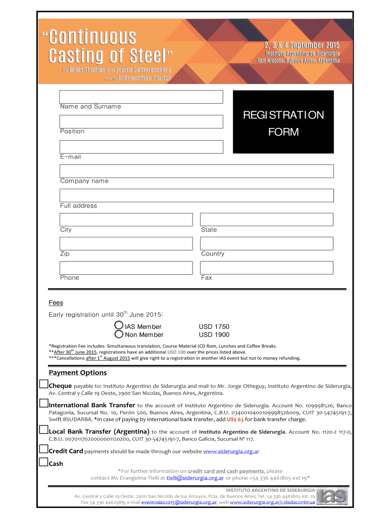 Name and Surname. Position. E-mail. Company name. Full address. City. State. Zip. Country. Phone. Fax. Fees Early registration until 30th June 2015: IAS Member USD 1750