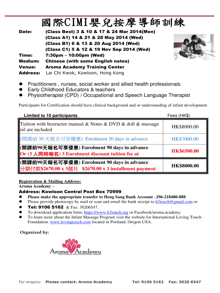 Date: Time: Medium: Venue: Address: (Class Best) 3 & 10 & 17 & 24 Mar 2014(Mon) (Class A1) 14 & 21 & 28 May 2014 (Wed) (Class B1) 6 & 13 & 20 Aug 2014 (Wed) (Class C1) 5 & 12 & 19 Nov Sep 2014 (Wed)