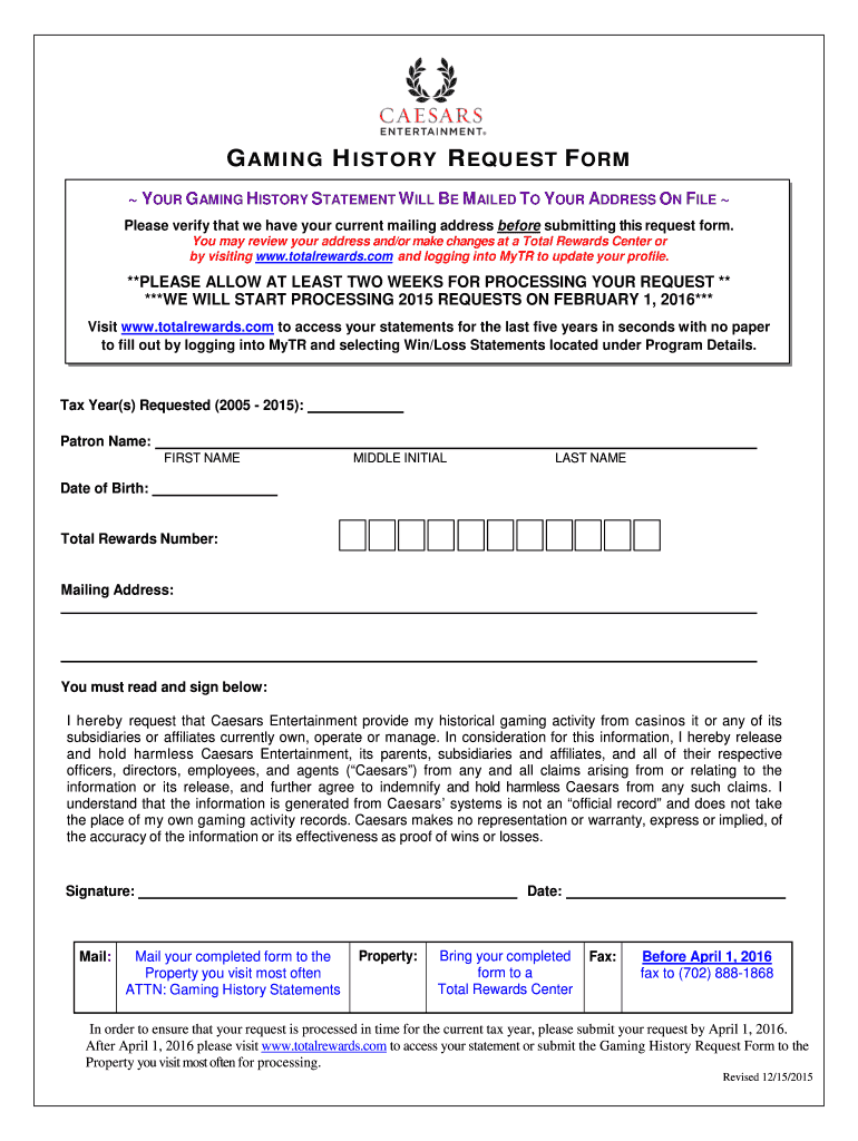 1 Feb 2016 ... GAMING HISTORY REQUEST FORM. YOUR GAMING HISTORY STATEMENT WILL BE MAILED TO YOUR ADDRESS ON FILE.