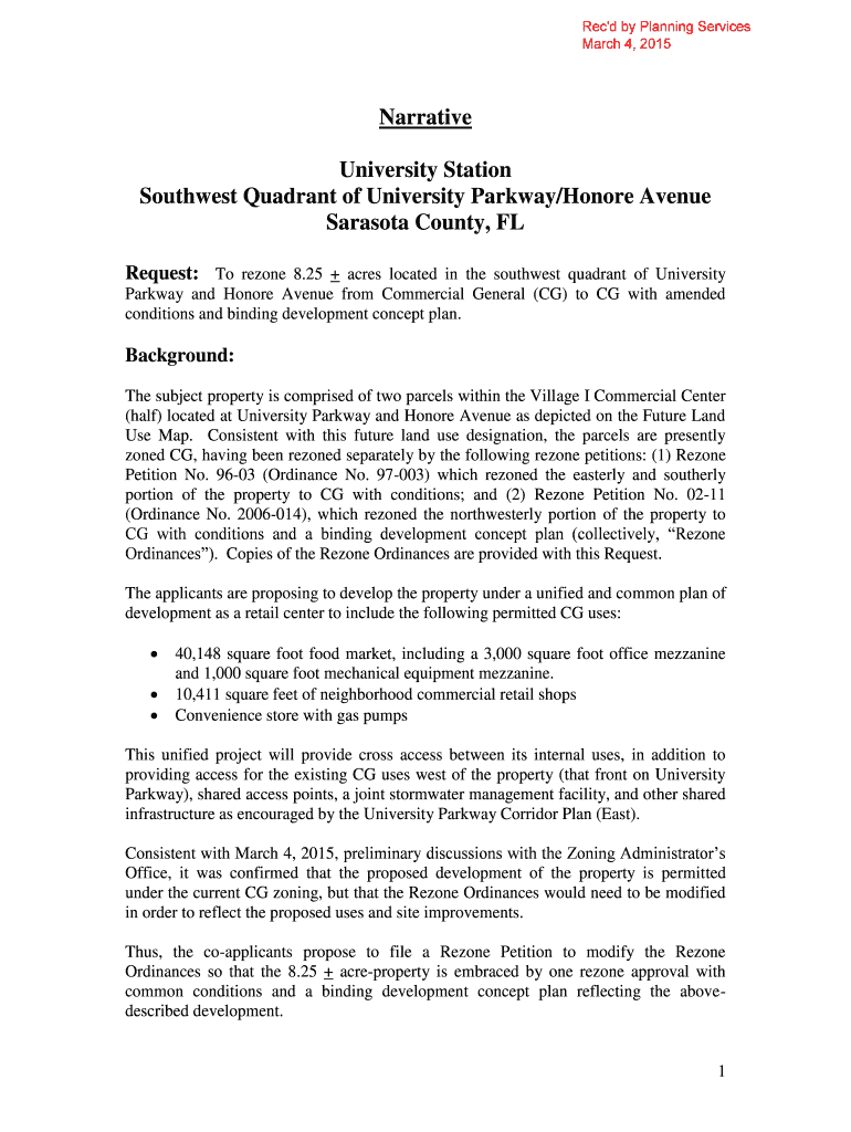 1 Narrative University Station. Southwest Quadrant of University Parkway/Honor Avenue. Sarasota County, FL. Request: To rezone 8.25 + acres located in the ...