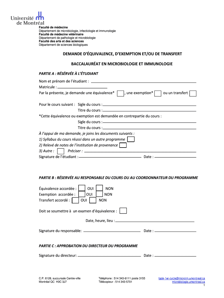 Get the free Demande d' quivalence, d'exemption ou de transfert de cours - microbiologie ...