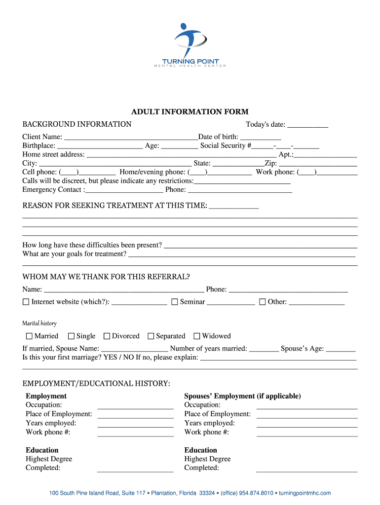 ADULT INFORMATION FORM BACKGROUND INFORMATION Today's date: Client Name: Date of birth: Birthplace: Age: Social Security # — — Home street address: Apt.: City: State: Zip: Cell phone: () Home/evening