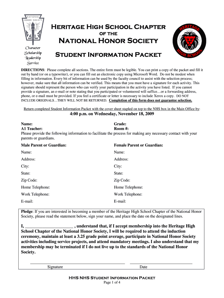 Get the free Heritage High School Chapter of the National Honor Society Student Information Packe...