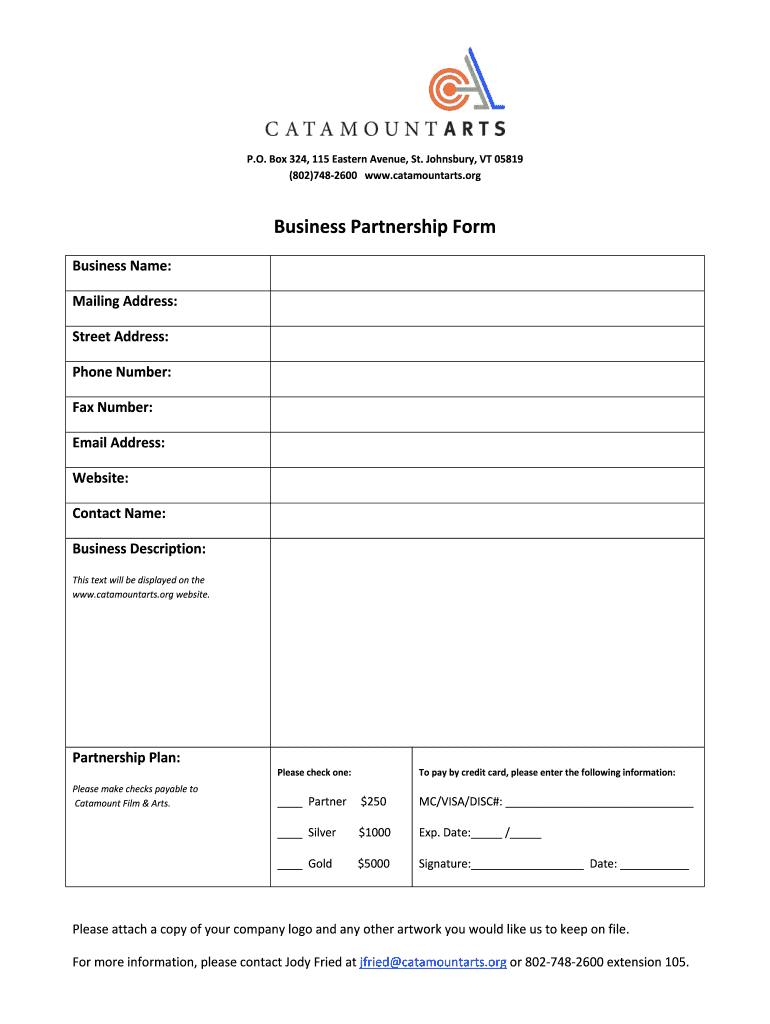 Get the free Business Partnership Form - Catamount Arts - catamountarts