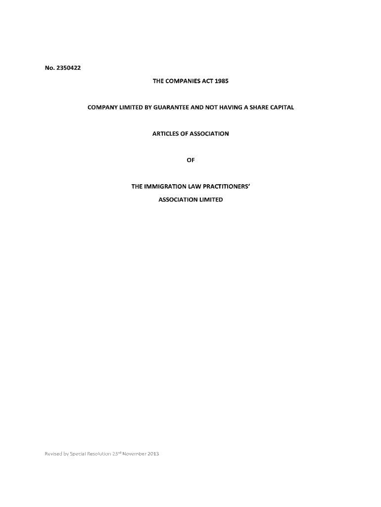 The Articles of Association is a document that outlines the rules and regulations governing the internal management and administration of the Immigration Law Practitioners’ Association Limited.
