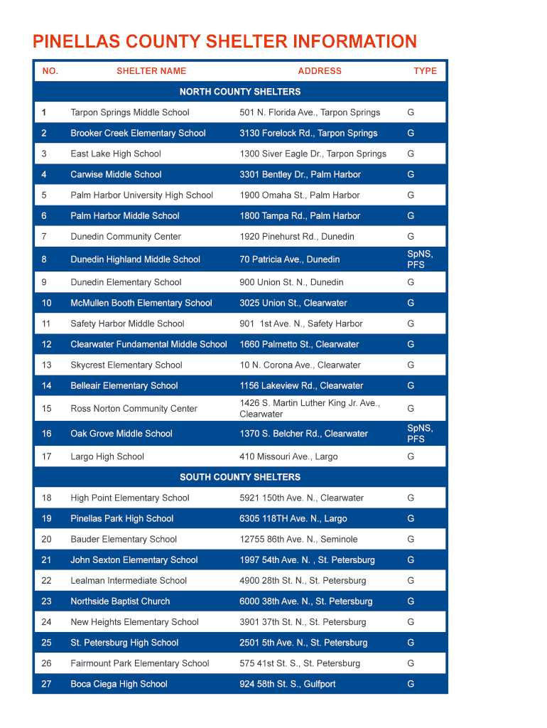 This document provides information regarding various shelters in Pinellas County, including their locations, types, and contact information for emergency management and other agencies.