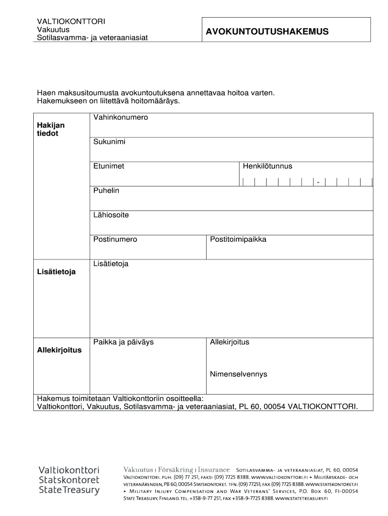 VALTIOKONTTORI Vaults Sotilasvamma- JA veteraaniasiat AVOKUNTOUTUSHAKEMUS Tulsa lomake Then lomake Han maksusitoumusta avokuntoutuksena annettavaa Horton marten. Hakemukseen on limited v bottom r