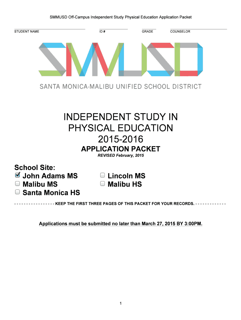 SMM USD Campus Independent Study Physical Education Application Packet STUDENT NAME ID # GRADE COUNSELOR INDEPENDENT STUDY IN PHYSICAL EDUCATION 20152016 APPLICATION PACKET REVISED February 2015 School