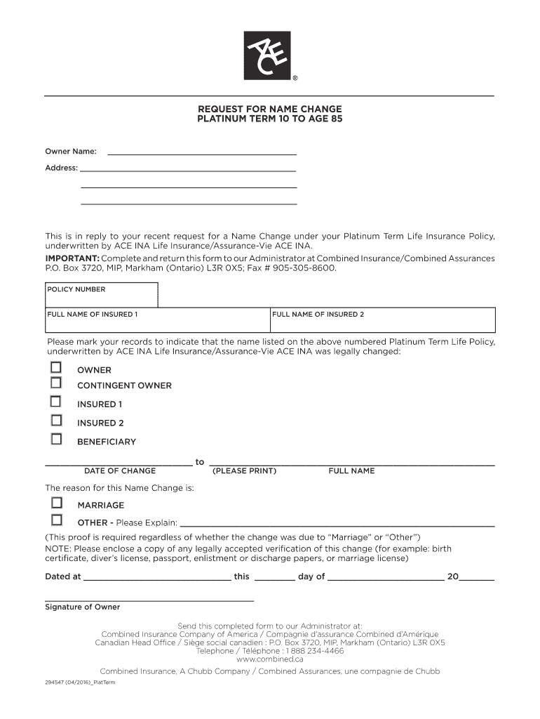 Combined Insurance, A Chubb Company / Combined Assurances, one companies de Chubb. 294547 (04/2016) Platter. STATEMENT OF LOST POLICY.