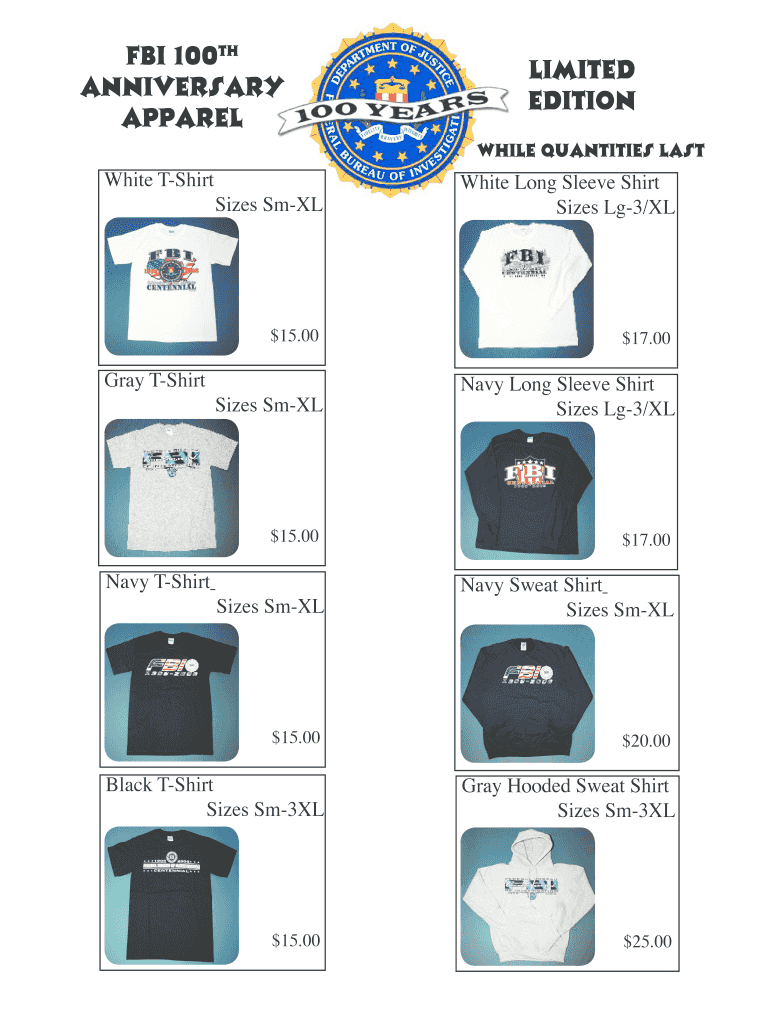 FBI 100th Anniversary apparel White Shirt Limited edition While quantities last $15.00 Navy Shirt $17.00 Sizes SML Navy Long Sleeve Shirt Sizes Lg3/XL $15.00 Gray Shirt Sizes SML White Long Sleeve