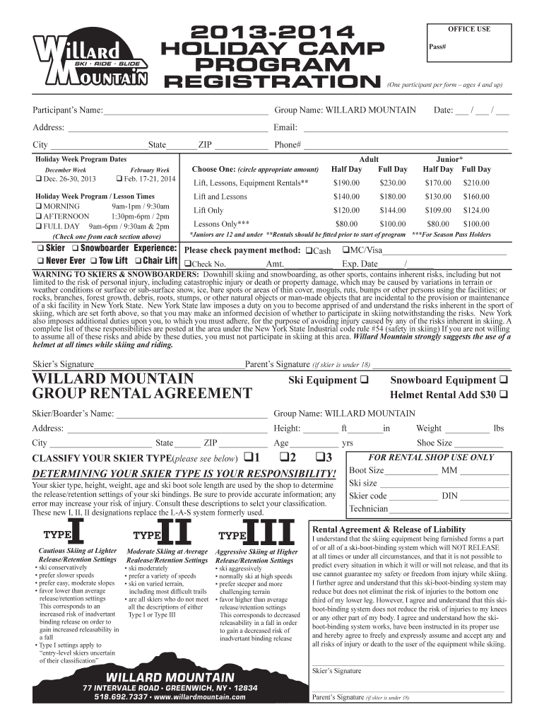 2013-2014 HOLIDAY CAMP PROGRAM REGISTRATION (One participant per form ages 4 and up) Participant s Name: Group Name: WILLARD ...
