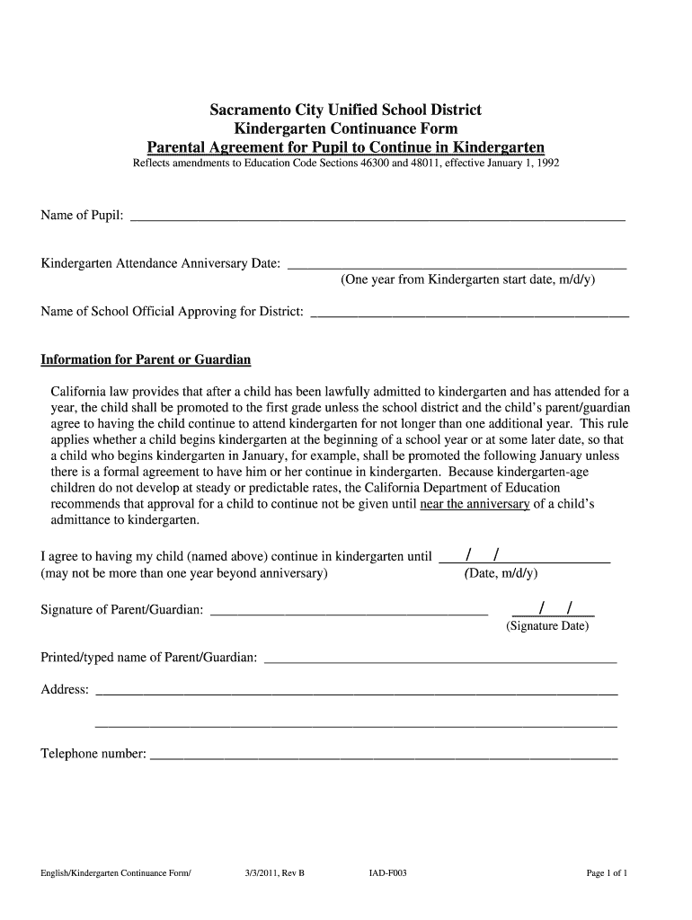 This form is intended for parents or guardians of children currently in kindergarten at the Sacramento City Unified School District, who wish for their child to continue in kindergarten for an additional year.