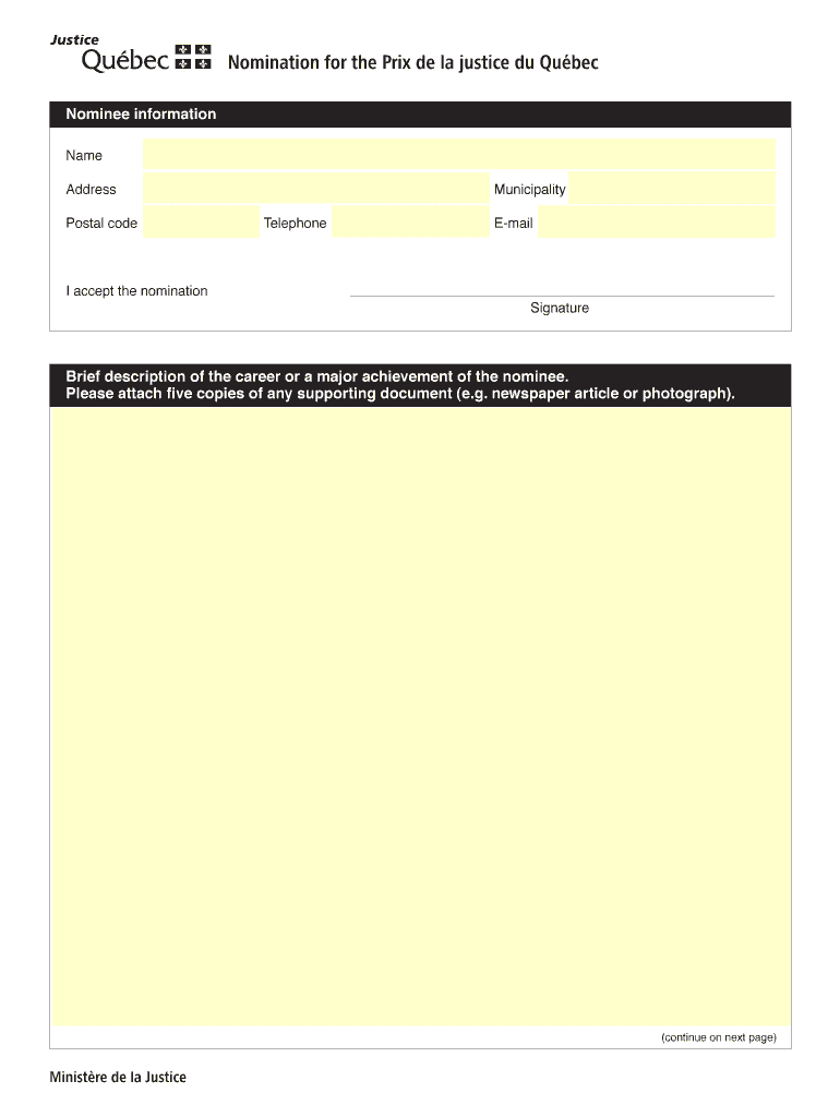 Any individual or organization that wishes to nominate a candidate for the Prix de la justice du Québec is required to file a nomination.