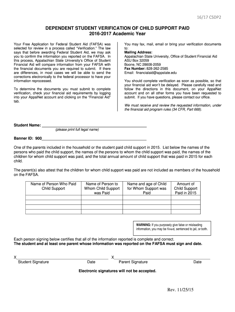 DEPENDENT STUDENT VERIFICATION OF CHILD SUPPORT PAID. 2016-2017 Academic Year. Your Free Application for Federal Student Aid (FAFSA) was.