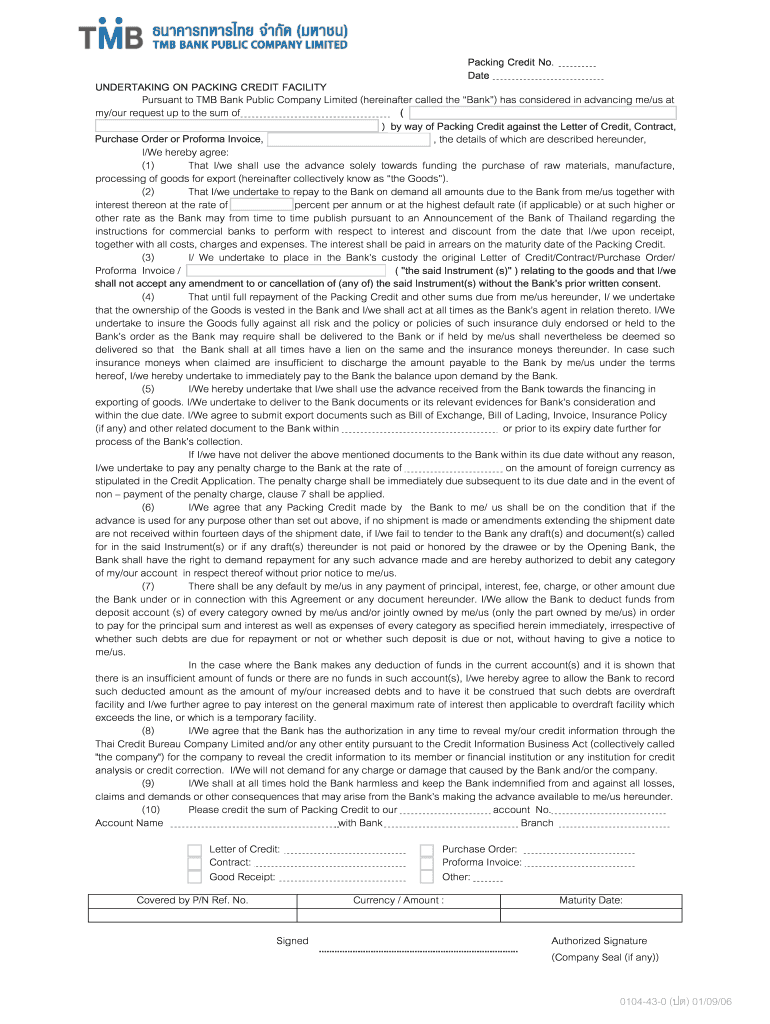 Packing Credit No. Date 1 UNDERTAKING ON PACKING CREDIT FACILITY Pursuant to TMB Bank Public Company Limited (hereinafter called ...