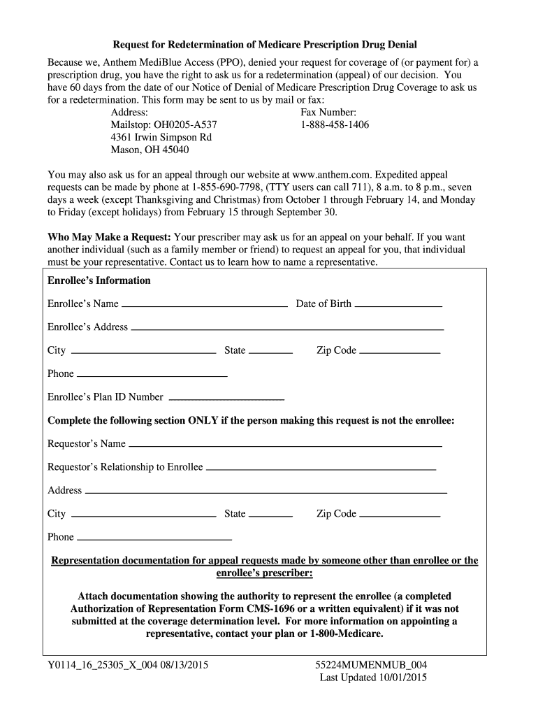 1 Oct 2015 ... Representation documentation for appeal requests made by someone other than enrolled ... Denial of Medicare Prescription Drug Coverage.
