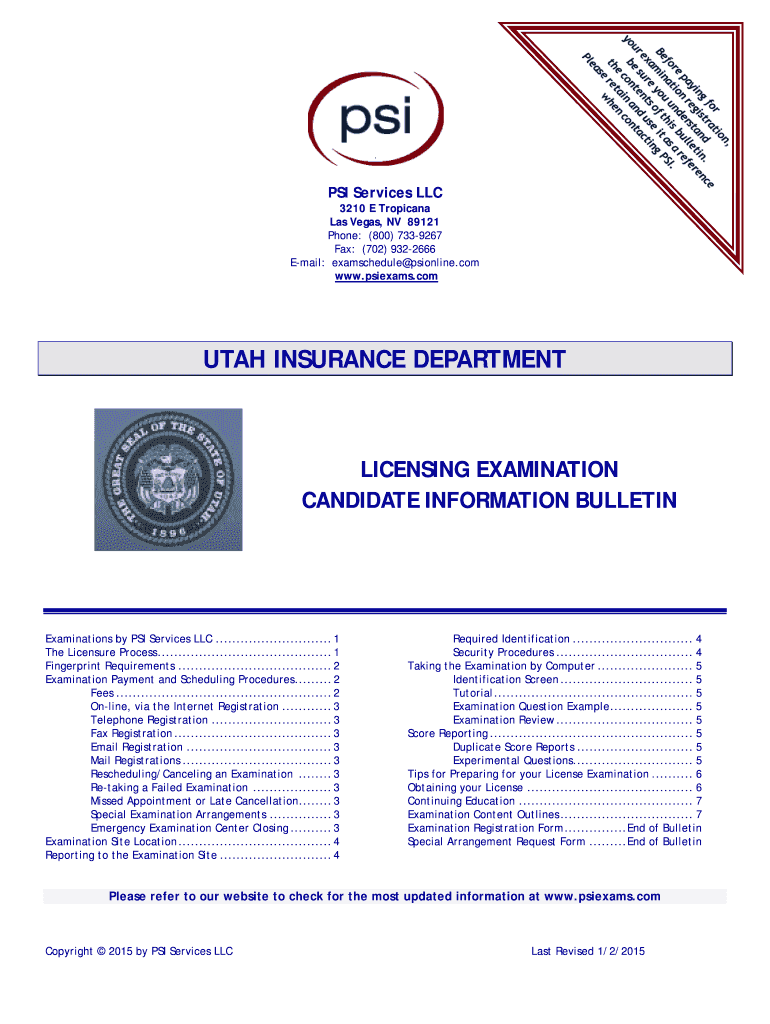 PSI Services LLC 3210 E Tropicana Las Vegas, NV 89121 Phone: (800) 7339267 Fax: (702) 9322666 Email: exam schedule psionline.com www.psiexams.com UTAH INSURANCE DEPARTMENT LICENSING EXAMINATION CANDIDATE