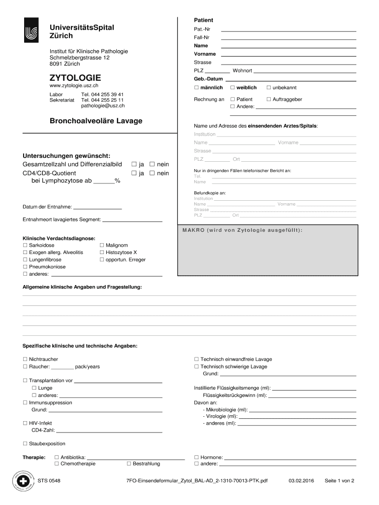 STS 0548 7FO-Einsendeformular STOL BALLAD 2-1310-70013-PTK.pdf 03.02.2016 Sate 1 on 2. University hospital. Z rich. Institute f r Klinische Pathologic.