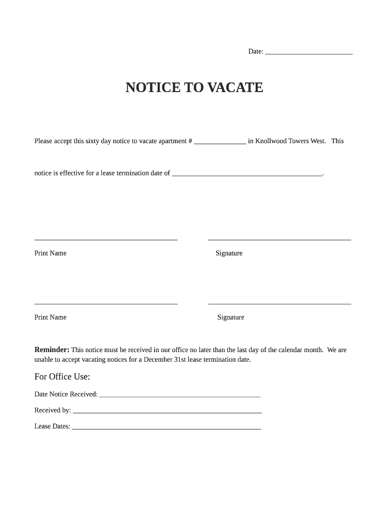 Date: NOTICE TO VACATE Please accept this sixty day notice to vacate apartment # in Knoll wood Towers West.
