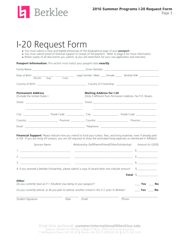 Get the free 2016 Five Week I-20 Request Packetpdf - Berklee College of Music - berklee