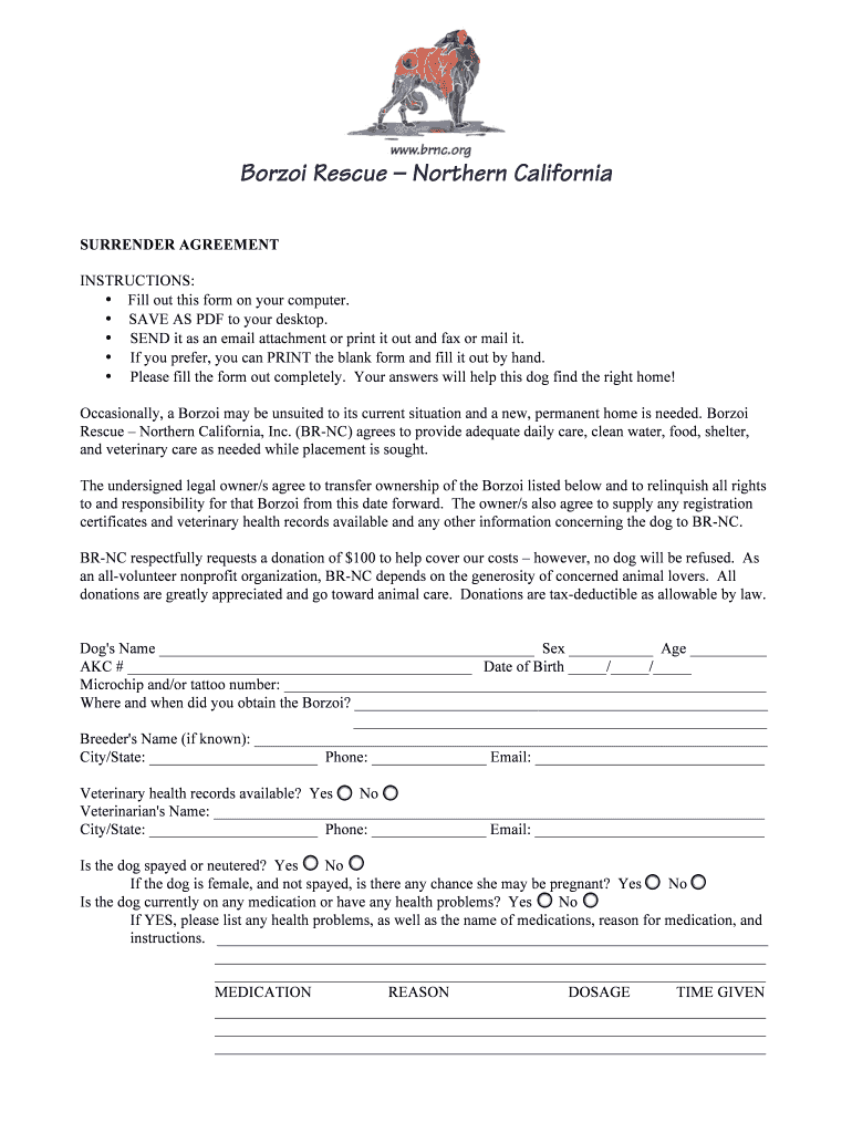 Borzoi Rescue Northern California SURRENDER AGREEMENT INSTRUCTIONS: Fill out this form on your computer. VESA AS PDF to your desktop.